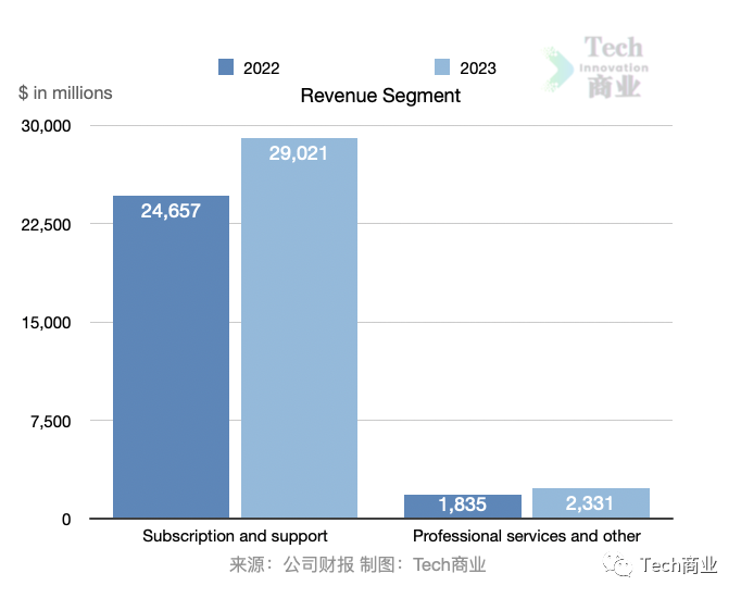 Salesforce公司收入来自1)订阅和支持、2)专业服务及其他两分部业务。订阅和支持业务2023财年收入为290亿美元,同比上一财年时期的247亿美元,本财年该项收入增长18%。本财年专业服务及其他收入为23亿美元,同比上一财年的18亿美元,该项收入增长27%。