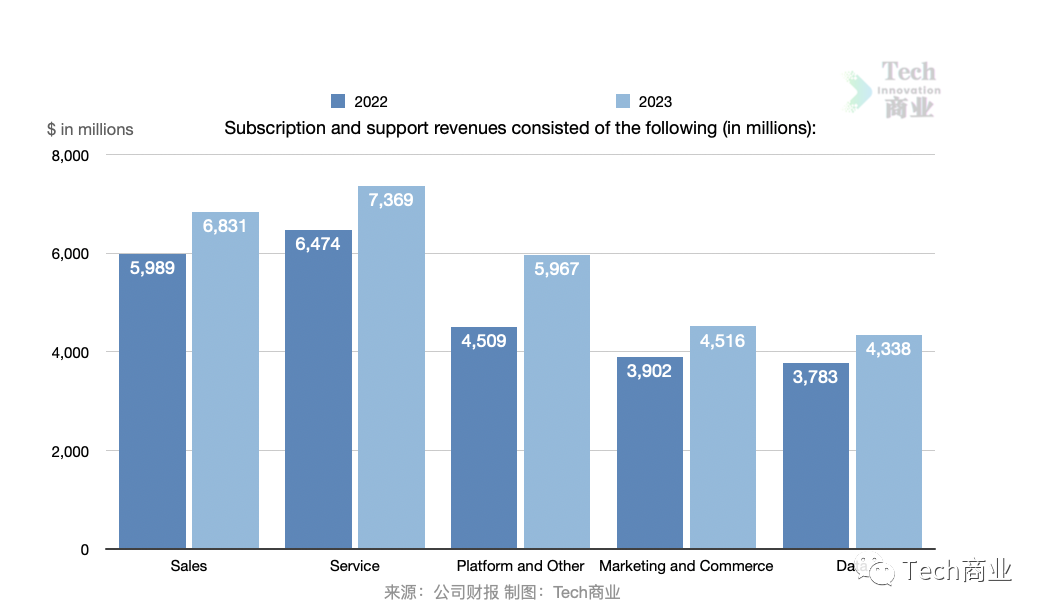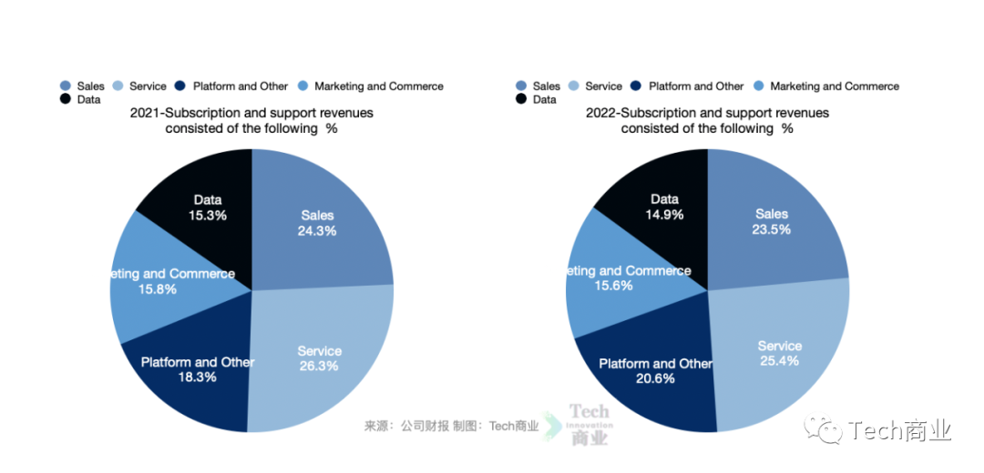 其中订阅和支持收入包括销售Sales、服务Service、平台platform及其他、营销与商务、数据五项产品服务。