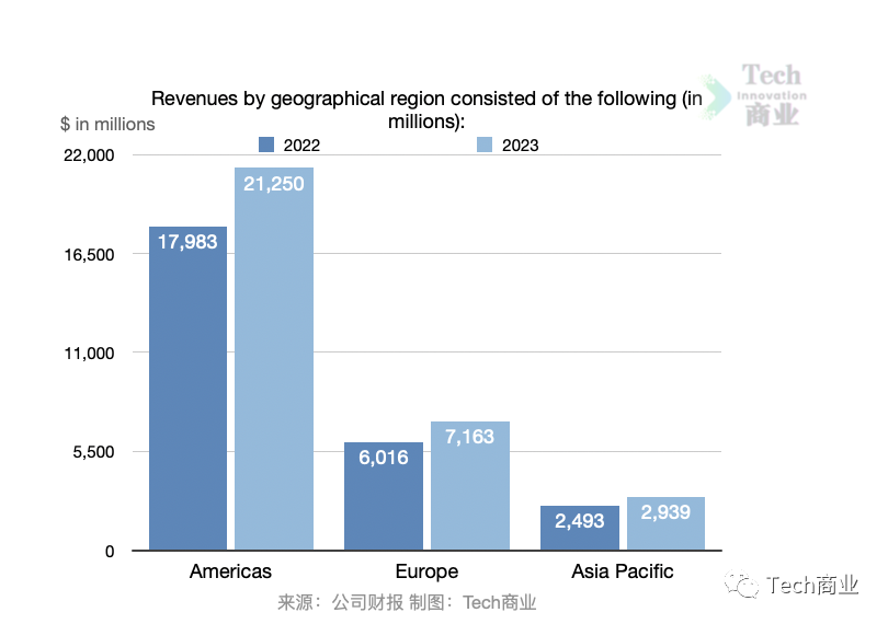 按地区收入来看,Salesforce公司2023财年213亿美元收入来自美洲地区,同比上一财年时期的180亿美元,增长18%。美洲地区本财年收入占比为68%。