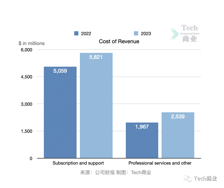 其中本财年订阅和支持业务收入成本为58亿美元,同比增幅为15%。专业服务及其他收入成本为25亿美元,同比增幅为29%。