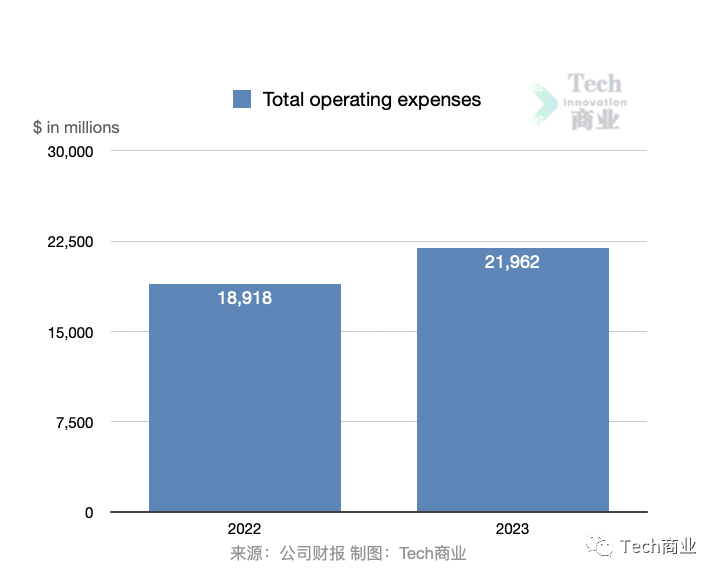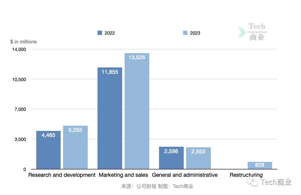 其中研发费用本财年为51亿美元,增长13%。营销与销售费用为135亿美元,增幅为14%。一般与行政费用为26亿美元,下降2%。