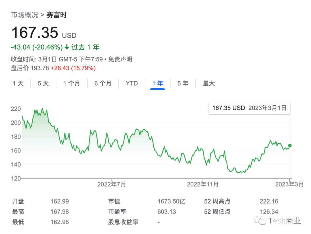 截至本文,该公司过去一年股价下跌20%,当前市值为1674亿美元。