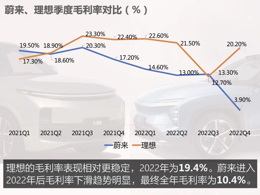 在2022年,蔚来和理想都在毛利率上有过“失守”,蔚来四季度的车辆毛利率为3.9%,大幅低于上年同期的17.2%和三季度的13.3%,官方解释由和老款“866”车型相关的存货拨备、生产设施加速折旧与购买承诺损失导致。剔除此方面影响后去年四季度的整车毛利率为13.5%。与前一季度相比有所下降的主要是产品组合变化,比如四季度毛利较低的车型ET5销量增加了。