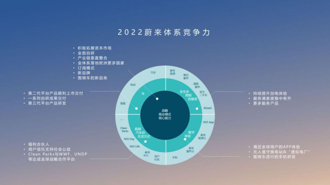蔚来给自己画了一个罗盘,内核的圈层是战略、商业模式、核心能力,中间圈层是在四个方面重新定义用户体验,包括车、超越汽车的生活方式、全生命周期的服务、数字体验,最外是应用层,覆盖智能、能源、手机、用户社区等多个方面。