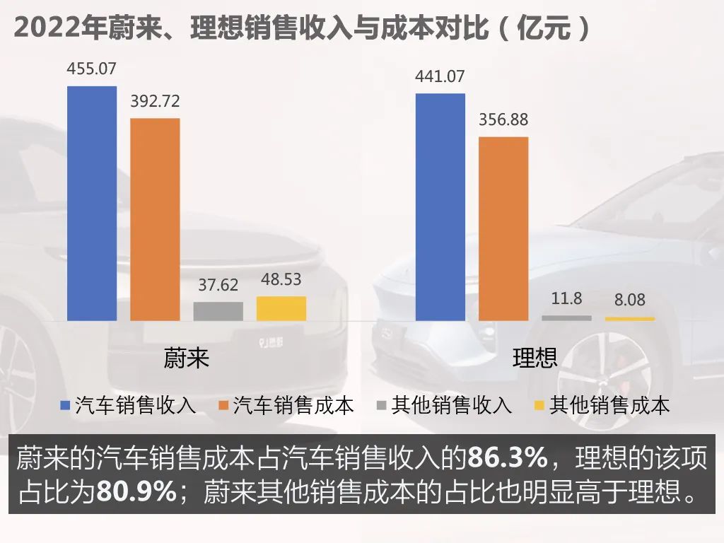 在汽车营收上,蔚来凭借高端调性,继续保持了新势力第一的位置。身后的理想则越追越紧,2022年汽车销售收入已经逼近蔚来的规模,而且单车成本控制比蔚来做得更好。