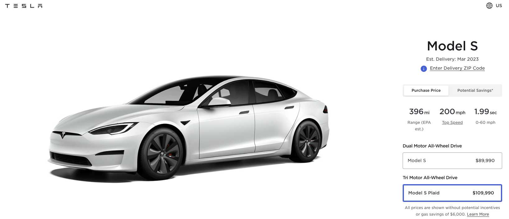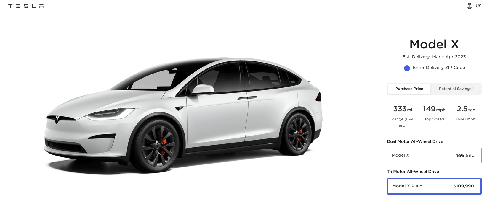 3月6日,特斯拉美国官网显示,Model S/X起售价下调,Model S现价89990美元(原价94990美元);Model S Plaid现价109990美元(原价114990美元);Model X现价99990美元(原价109990美元);Model X Plaid现价109990美元(原价119990美元)。
