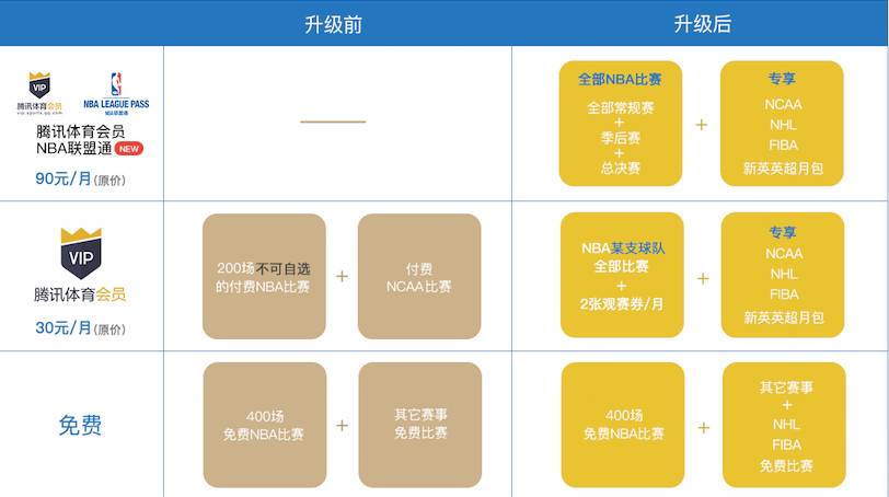 因此,我们可以看到英超这样的顶级职业体育联赛已在中国尝试了多年的付费观赛模式,而中超这样的本土化联赛也正构筑着自己的收费模型。而自上赛季开始,腾讯体育也将600场的NBA赛事转播分为了收费与免费场次,其中400场为免费场次,200场为收费场次,会员套餐价格为每月30元,而包年价格则为298元。