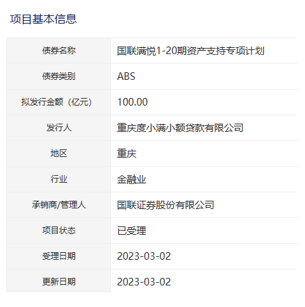 深交所平台显示,“国联满悦1-20期资产支持专项计划”项目状态为已受理,更新日期为2023年3月2日,项目类别为ABS,拟发行金额100亿元。发行人为重庆度小满小额贷款有限公司(简称“度小满小贷”),管理人为国联证券股份有限公司。