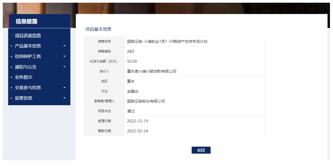 深交所显示,“国联证券-小满助业1号1-10期资产支持专项计划”项目状态为已通过,更新日期为2023年2月24日,项目类别为ABS,拟发行金额50亿元。