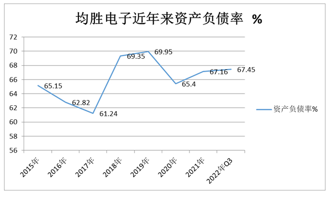 此外,2015年至2022年前三季度,均胜电子的资产负债率分别为65.15%、62.82%、61.24%、69.35%、69.95%、65.40%、67.16%、67.45%,近些年处于高位几乎无变化。