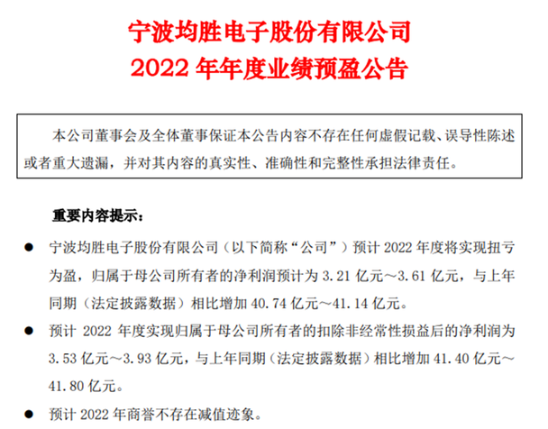 近日,均胜电子(600699.SH)发布了2022年业绩快报。快报显示,经过一系列降本增效措施,均胜电子2022年实现营业收入497亿元,同比增长约9%,实现了扭亏为盈;当期归属于母公司所有者的净利润预计为3.21-3.61亿元,与上年同期相比增加40.74-41.14亿元。