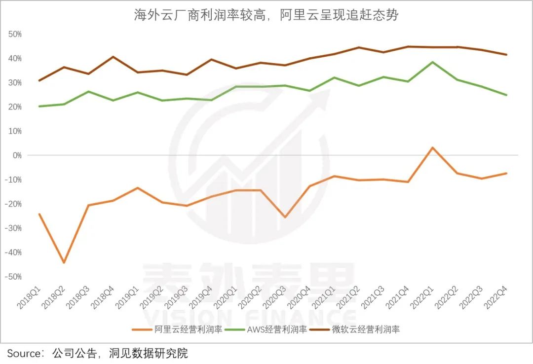 然而众所周知,国内云厂商过去几年都是“风光在外”,内里不赚钱。如下图,微软云、AWS的利润率常年保持在20%以上,而国内的云厂商则长期亏损。