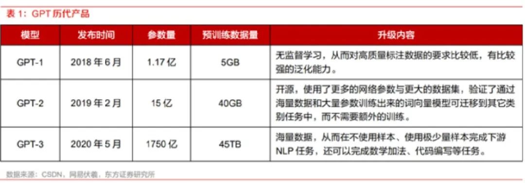 如下图,ChatGPT所搭载的模型(GPT3.5),从GPT1迭代到GPT3,预训练数据量从5GB激增到45TB,增长幅度接近千倍。