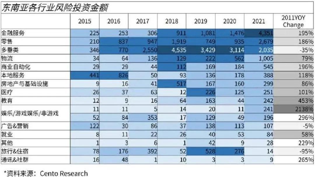据cento数据,2015-2021年,东南亚的总风险投资数量激增。2021年总交易额实现了70%的同比增长,且预计到2025年还将翻三倍。