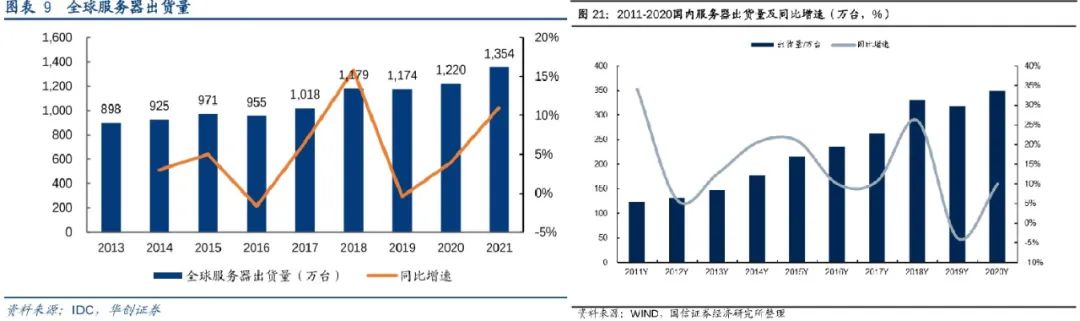 如下图,2017-2018年左右,全球服务器出货量达到增长高点,国内增速顶峰稍有滞后,但基本保持一致。