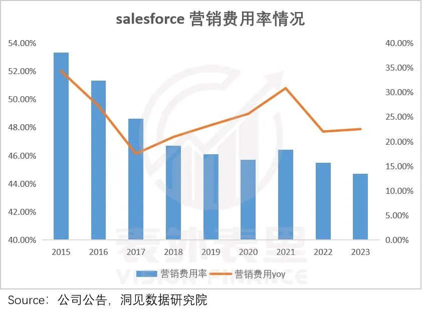 以Salesforce为例,收购协同办公平台Slack后,2020-2022年,营销费用率从46.4%下降到历史最低点44.7%。