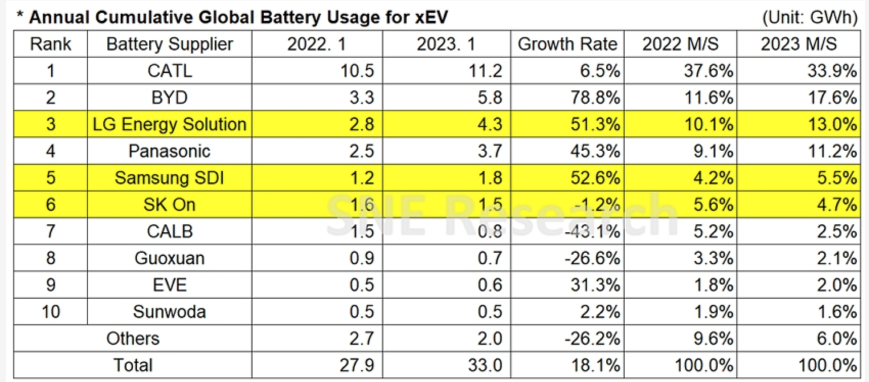 包括LG新能源在内,三家上榜韩国电池企业的总市占率为23.2%,同比增长3.3个百分点。