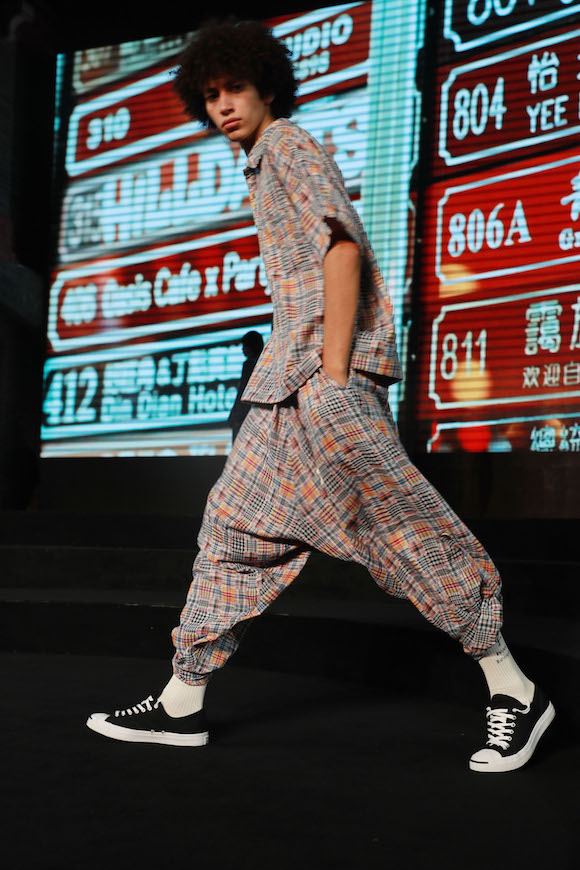 “市井”可以当作整场秀的一个关键词,就好像除了街景意象的表达,周晓雯还特意通过面料的做旧来表现过着平凡生活的香港居民。不过在周晓雯看来也许用“街头”来做同义关键词会更合适。她在过去总被当作中国风的践行者,而这次香港市井百态的呈现就是她想做出的中国街头风。看看模特们高腰而着的内裤又或是那些调档垮裤吧,街头风的感觉是不是更明显了?
