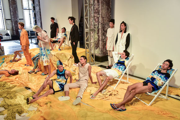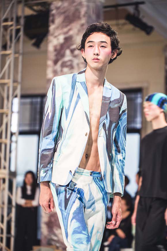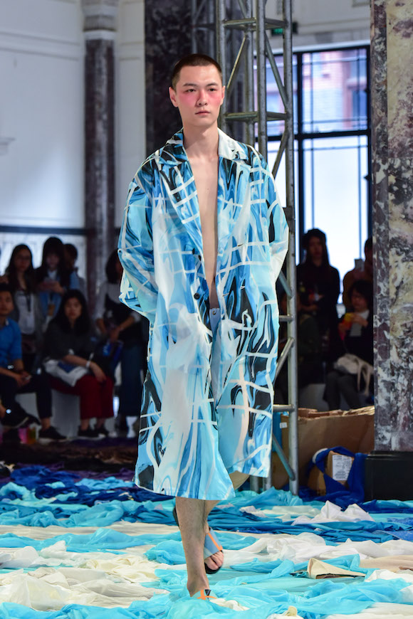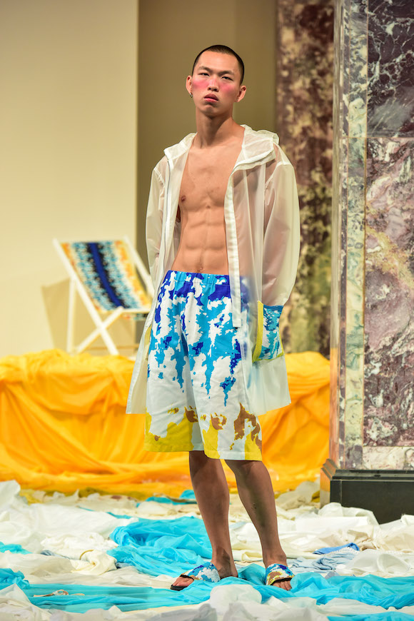 这个用衣物做出的沙滩源于张运鸿创作的一幅描绘自己家乡海南的画。由此延伸,这幅描绘从沙滩到深海远景的画同时被转化成数字印花,成了他这一季最主要的设计元素。