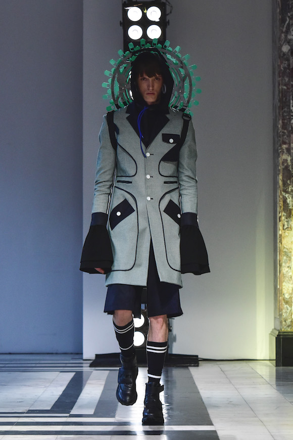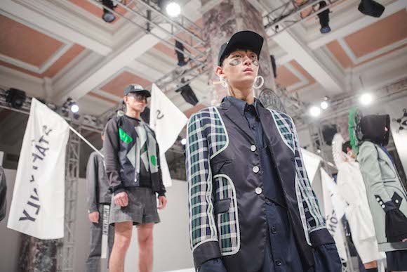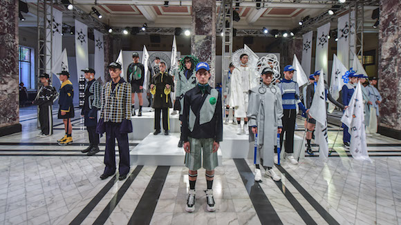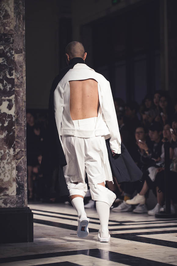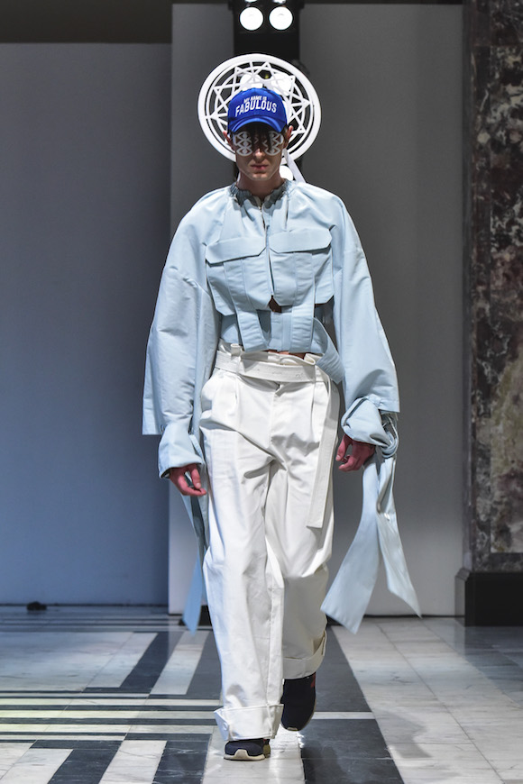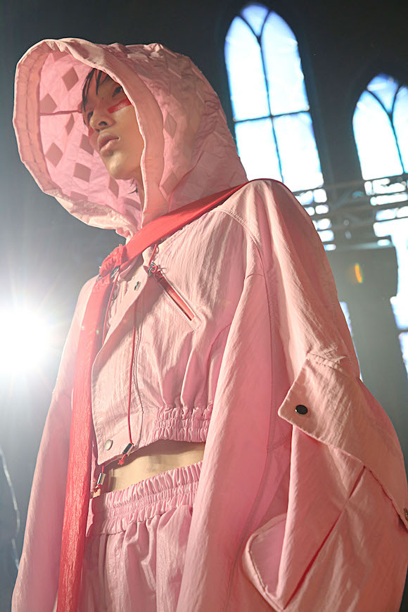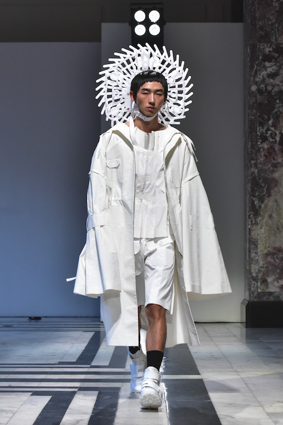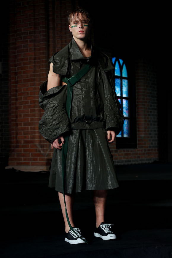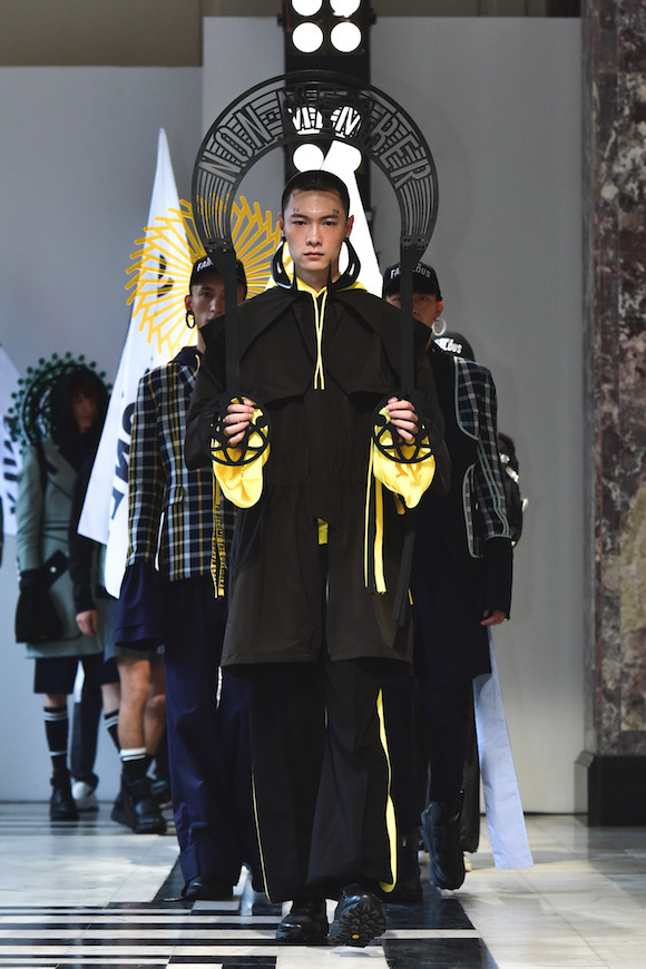 从展示来说整场演示完成度令人惊喜,尤其是当模特分为两队在演示的尾声分别从秀场两端走出——他们一队以举着大旗的模特为首,一队则由拿着宗教风格图腾装饰品的模特领队,配合神圣的配乐,在一面面高挂在秀场天花板上的宗教图腾旗帜下走过——从服装、配饰,到场地、音乐,都配合紧密,有序统一。