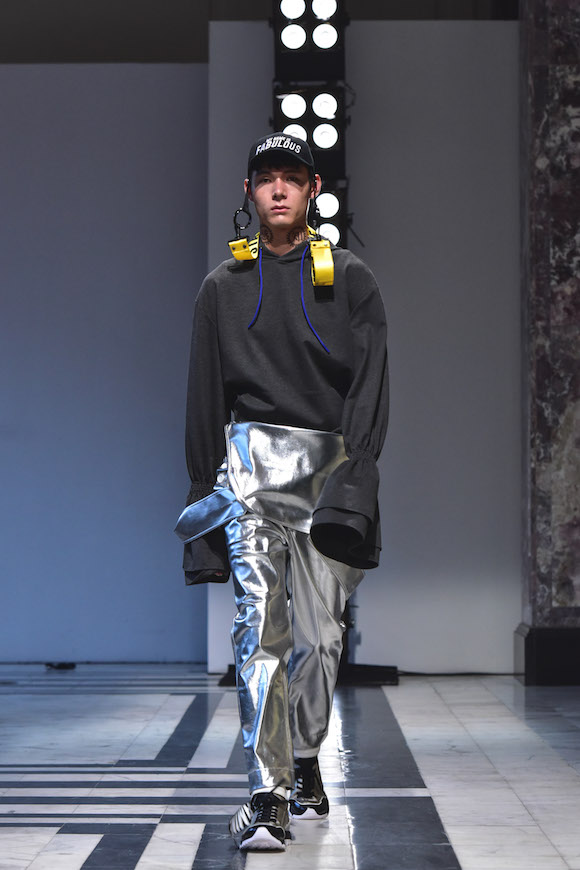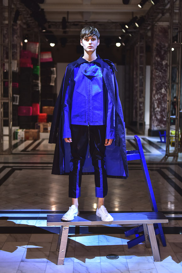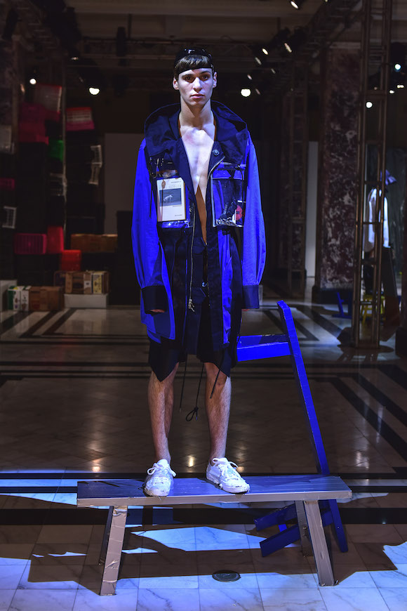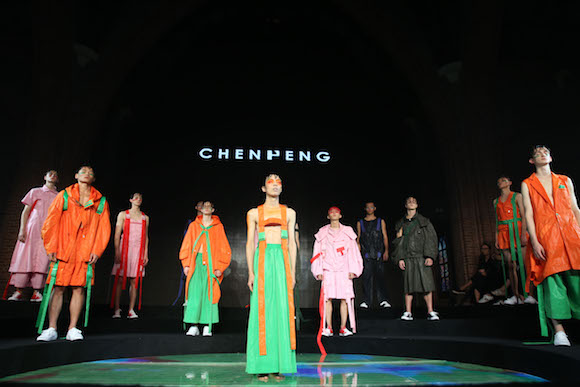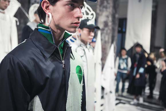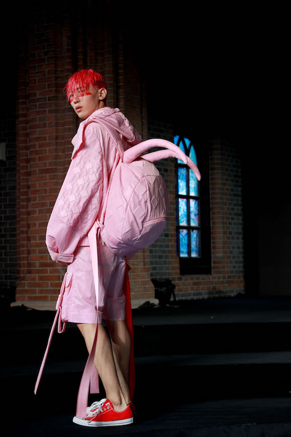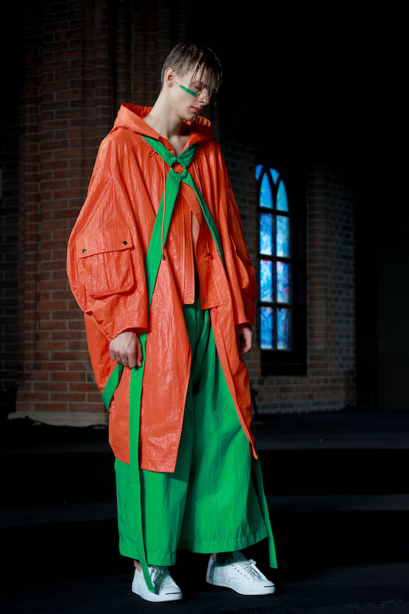 看完CHEN PENG的秀,给人留下最深刻的印象就是强烈的撞色、长长的飘带以及用了亮面布料充入了泡沫材料的“羽绒衣”。这是设计师对自己从2015年自伦敦时装学院毕业以来对自创品牌过程所做思考的一次表达。整个系列的主题被定为“Sink or Swim浮沉”。由此延伸开来,设计师将救生衣和安全带的最核心元素进行了提取,并加之时装化的处理做出了整个系列。