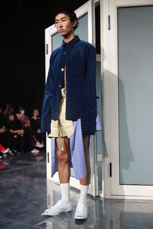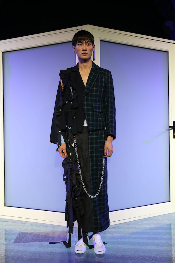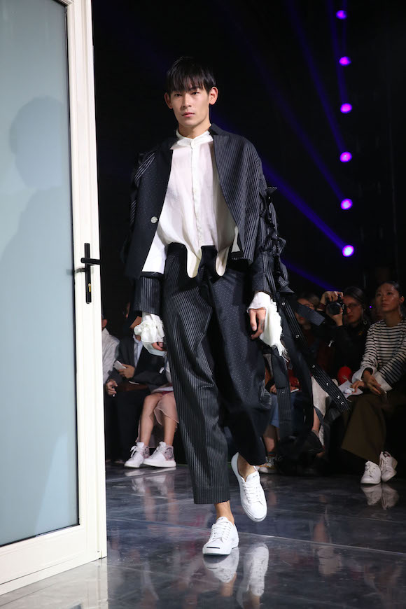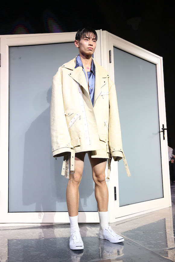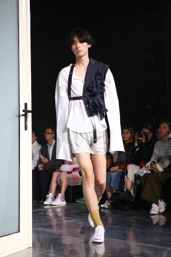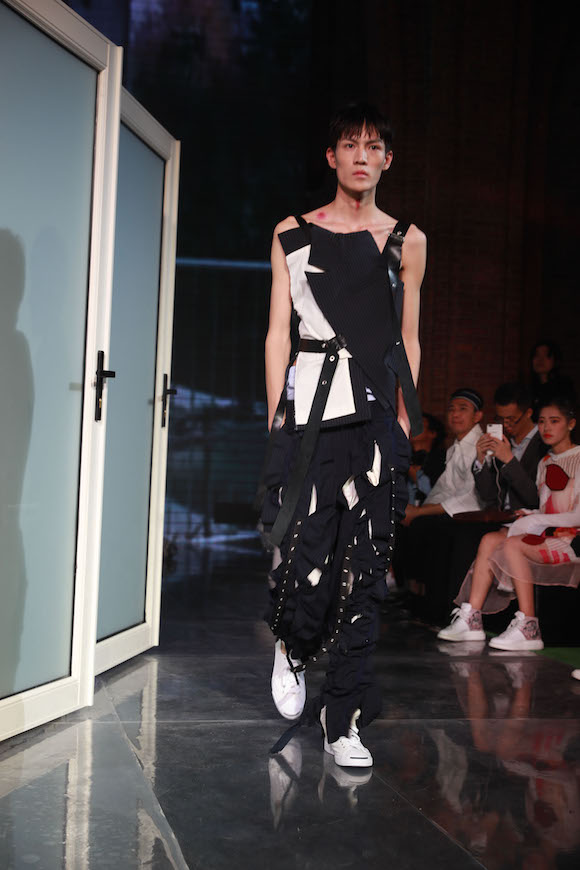 对于日本“暴走族”文化颇感兴趣的,林筠苇以日本电影《蓝色青春》为灵感,将校服以“破碎的浪漫”为主题,打碎、再造。那些支离破碎的校服有的被拉伸得更长、更宽、更大,有的则被分解得更精细,甚至更像是种装饰物。整个系列统一度很高,几件单品即使不做特定造型,交叉混搭依旧能实现相似的视觉冲击。但未进行商业化发展的她也会遇到设计实穿性欠佳的问题,尤其是一些过于小件的装饰性马甲外套、大敞口衬衫等也许并不会太对男性顾客,尤其是国内男性顾客的胃口。