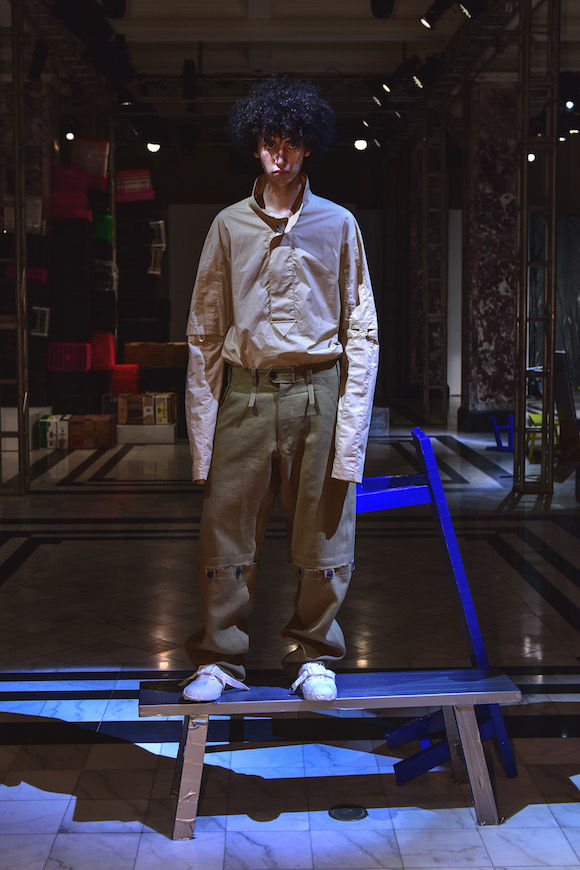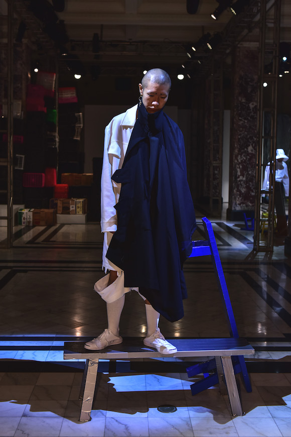 秀场布置则体现了另一种冲撞。当模特穿着带有皮料、丝绸等“高级面料”的服饰从观众面前走过,他们头上或是鞋头缠起的一圈圈粗胶带连同秀场用货运塑料筐垒砌的“垃圾堆”,就会和设计本身形成冲突感,容易给人留下更为深刻的印象,引发更多的思考。