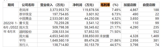 以2022年年中的数据为例,周六福的毛利率达到44.57%,而和周六福业务类似的周大生同期毛利率只有21.17%。素金批发业务占比更高的老凤祥、中国黄金同期毛利率分别只有7.49%和4.32%。在可比同行中,周六福毛利率显著高于行业平均的21.86%。