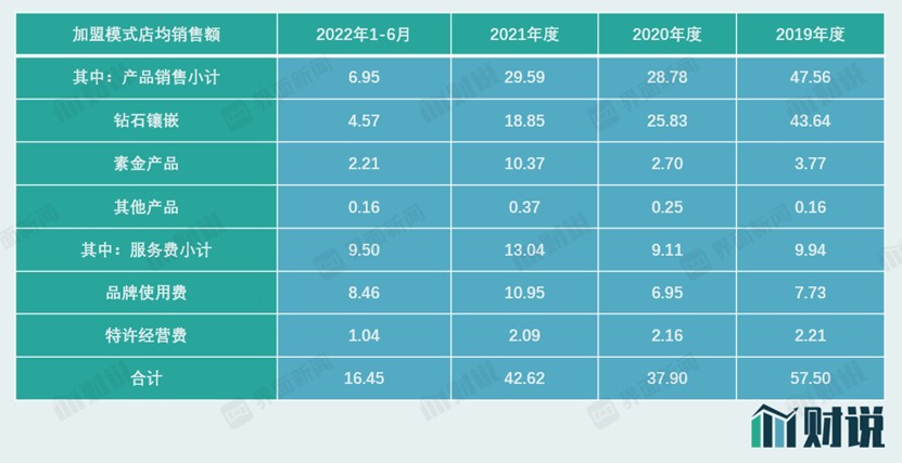 但是,“入网”模式下成长起来的加盟商其实也会和周六福自己的销售形成竞争。在加盟商销量不大幅增加情况下,加盟商从指定供应商处采购增加就会降低其从周六福处采购的数量。从加盟商店均销售数据来看,钻石镶嵌类产品销量从2019年的43.64万元下降到2021年的18.85万元。同期,品牌使用费则从7.73万元增加到10.95万元。