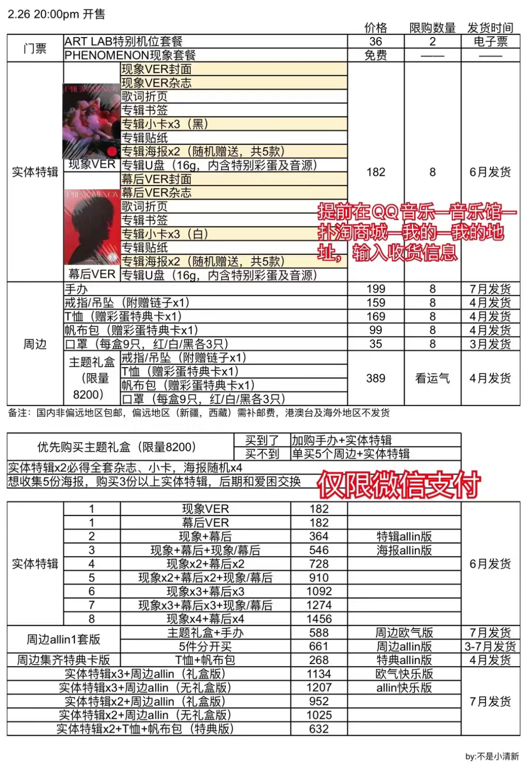 有粉丝还对专辑各种组合的套餐做了总结,在粉丝做的表格中,分为门票、实体特辑、周边、以及优先购买主题礼盒,不同的套餐价格也不同,最低价格是36元,最高价为1456元。