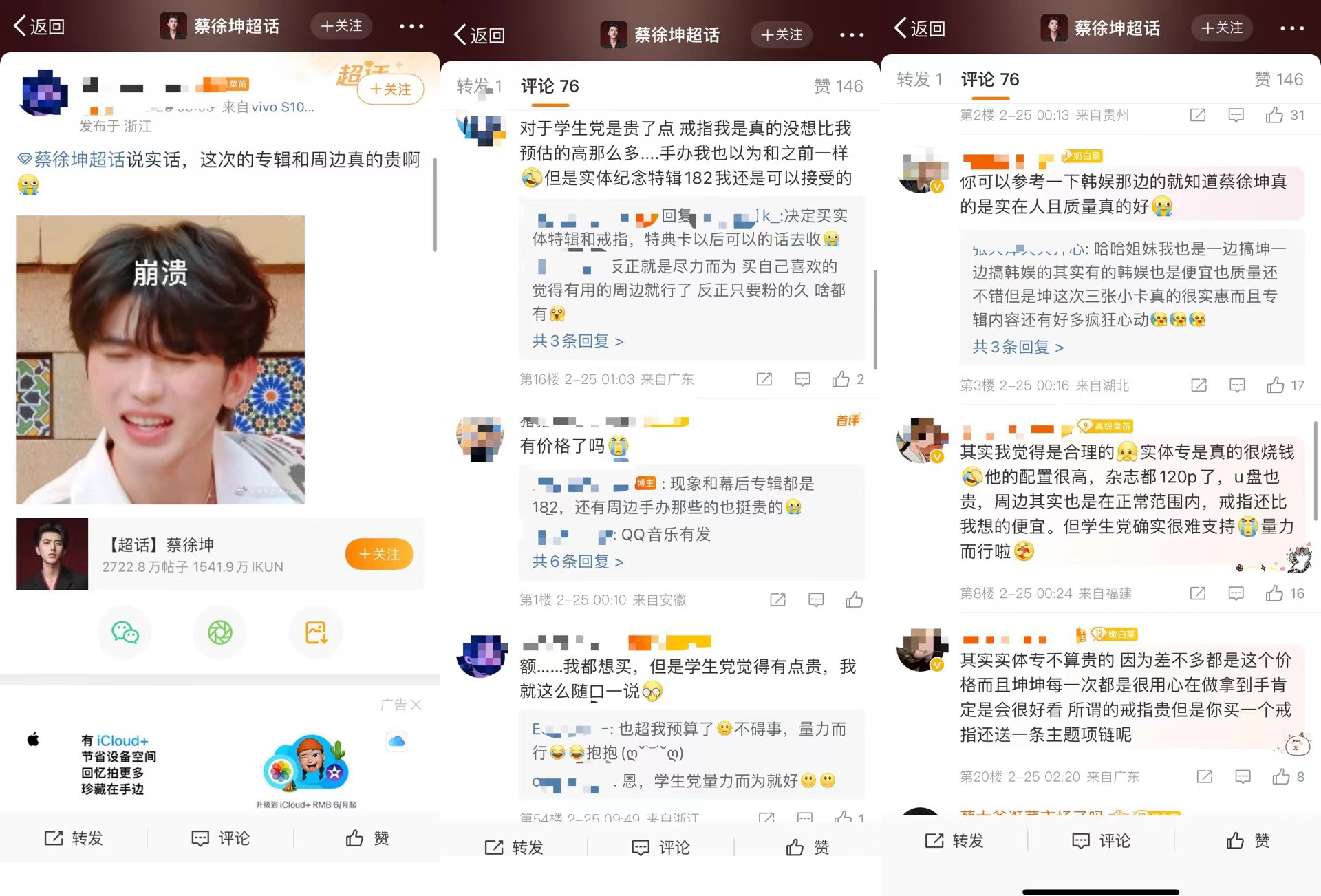 评论中不少学生党都觉得比自己预估的要贵出不少,买起来有些吃力,不过也有不少粉丝觉得相较于韩娱,蔡徐坤的专辑质量更好,并且贵是因为配置比较高。