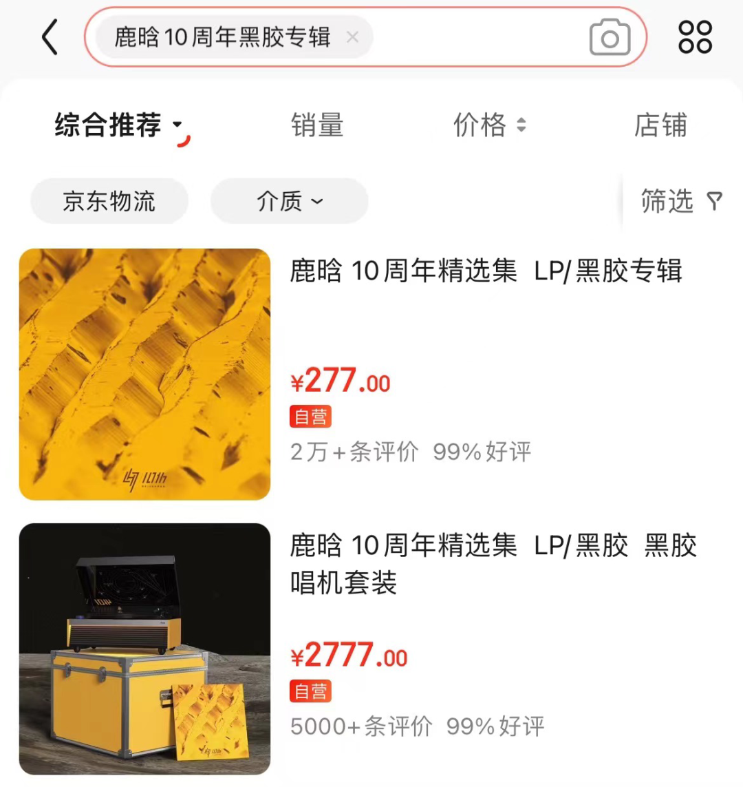 排名第二的鹿晗,同样发行的是黑胶唱片,不同的是,除了黑胶唱片外,还有黑胶+唱片机的组合。黑胶唱片定价在277元,但加上黑胶唱片机后,售价达到了2777元。京东显示,《鹿晗10周年精选集 LP/黑胶专辑》的评价有2万+,唱片机套装的评价有5000+,也就是说,黑胶唱片的销售额超过554万元,而唱片机套装的销售额至少1388万元。
