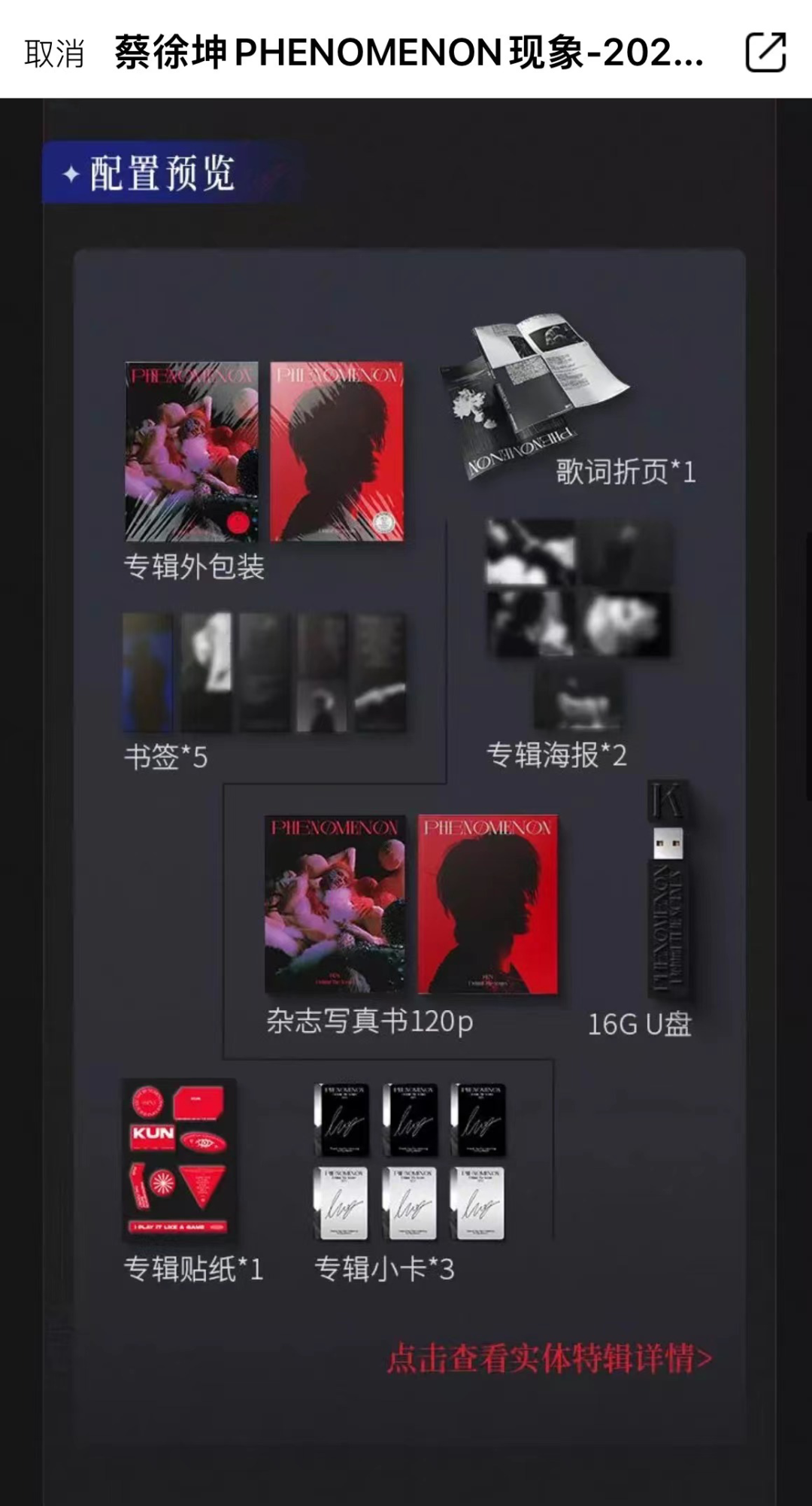 实体专辑的售价为182元,分为两款,现象VER和幕后VER,两者的差别在于封面和小卡的不同。专辑中包含了封面、杂志、歌词折页、专辑书签、三张专辑小卡、专辑贴纸、两张专辑海报,不过特别的是,不同于常见的CD或黑胶形式的专辑,蔡徐坤这张专辑采用的是U盘形式。