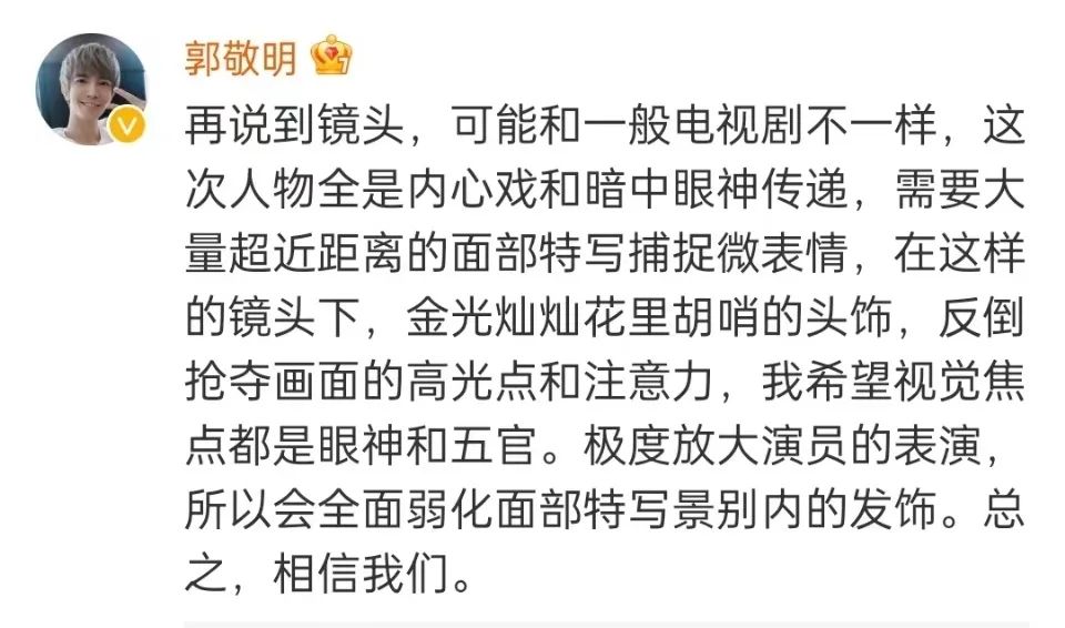 郭敬明在回复网友时,收尾句说的是“总之,相信我们”。《云之羽》究竟是怎样一部剧作,尚需等作品正式与观众见面,才好定夺。