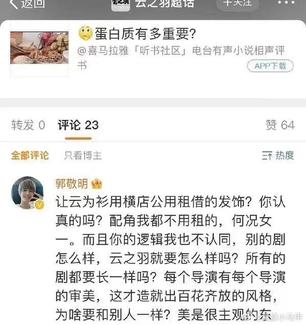 而郭敬明深谙如何在影视作品上用精致风格戳中观众审美快感,又懂得迎合网民的娱乐喜好,及时抓取热度,创造热梗、玩转热梗。《云之羽》最初映入大众眼帘时,郭敬明就着网友对演员发饰廉价的质疑,进行一番辩论,其中着重输出了导演审美百花齐放、精心考量镜头美感等内容。