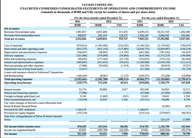 财报数据显示,2022年第四季度,瑞幸的净利润只有5450万元,同比下降94%。