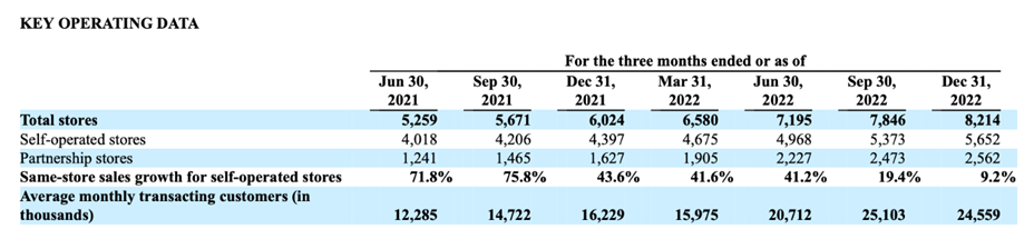 截止2022年末,瑞幸净新增门店数量为2190家,同比增长36.4%。四季度净新开门店368家,环比增长4.7%。其中,新增1255家自营门店,新增935家联营门店,瑞幸的总门店数已达8214家。