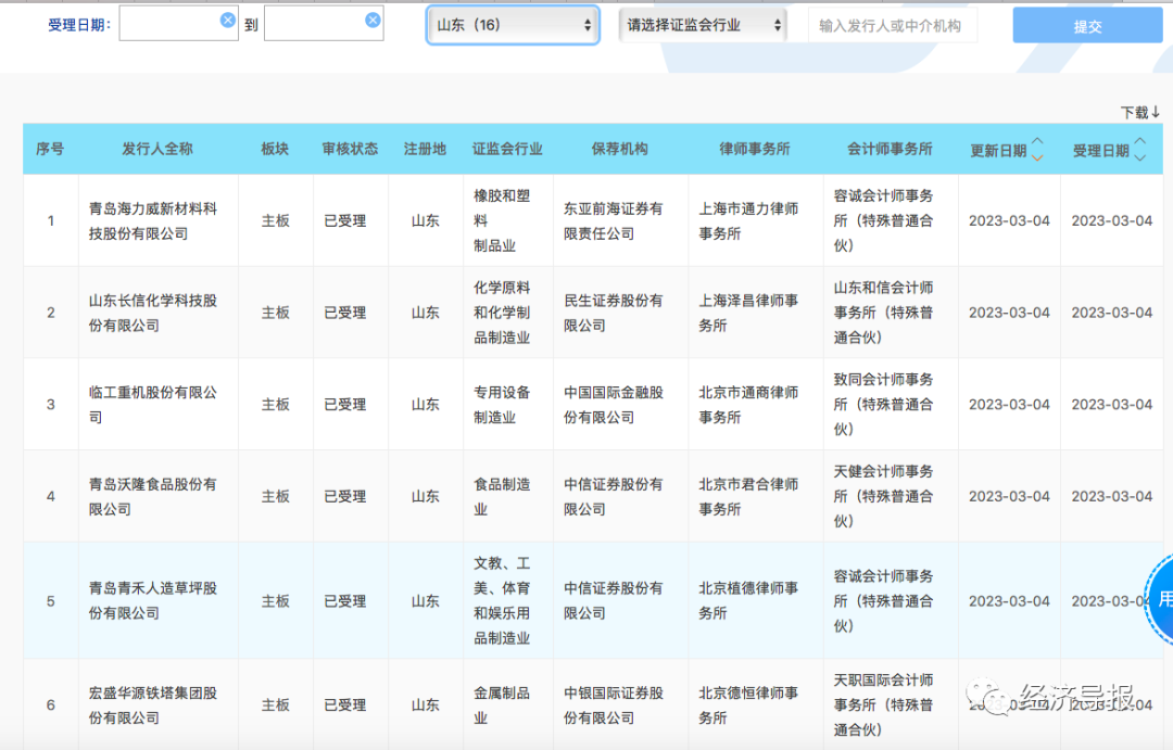 深交所主板项目申报页面显示,从2月23日至3月2日,山东有5家企业在深交所申报主板上市。