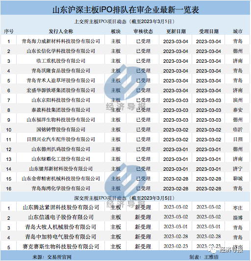 根据上交所、深交所披露情况,经济导报记者梳理发现,截至2023年3月3日,原本已在证监会排队进行主板IPO审核的15家山东企业纷纷“平移”至交易所。其中,移至上交所主板10家,移至深交所主板5家。