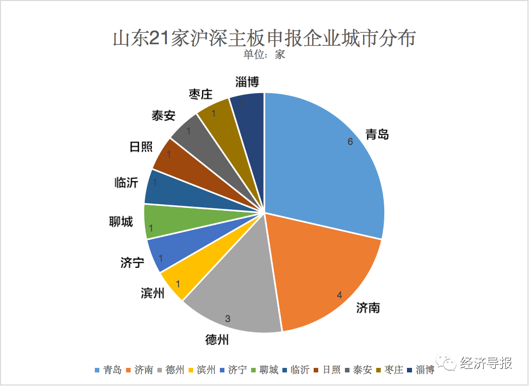 从区域情况来看,21家主板申报企业分布在山东11个城市。青岛、济南、德州成为“赢家”,沪深主板申报企业分别为6家、4家、3家。此外,滨州、济宁、聊城、临沂、日照、泰安、枣庄、淄博各1家。