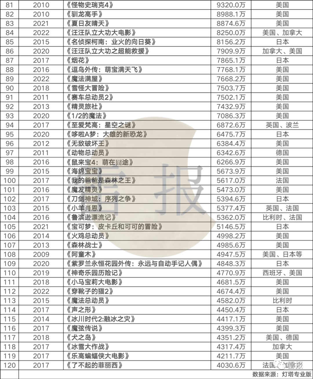 至于具体是哪些影片组成了这样的贡献和结构?以下为历年中国大陆“进口动画电影”票房前120位(含第120)的作品榜单(数据来源:灯塔专业版):