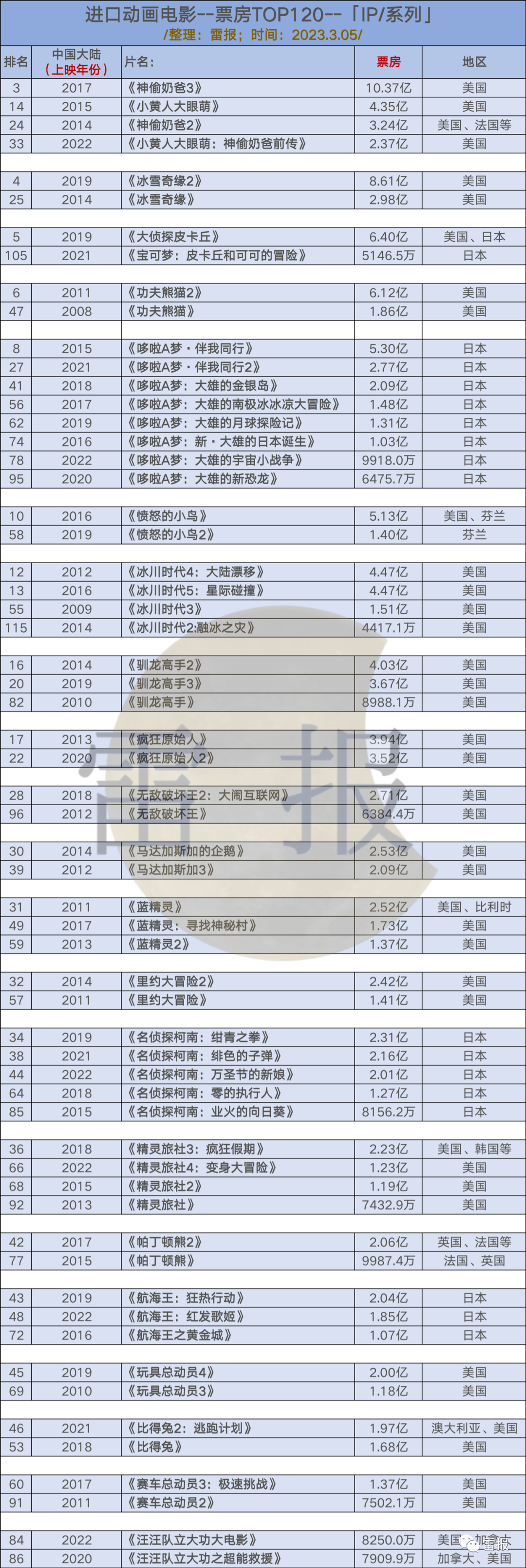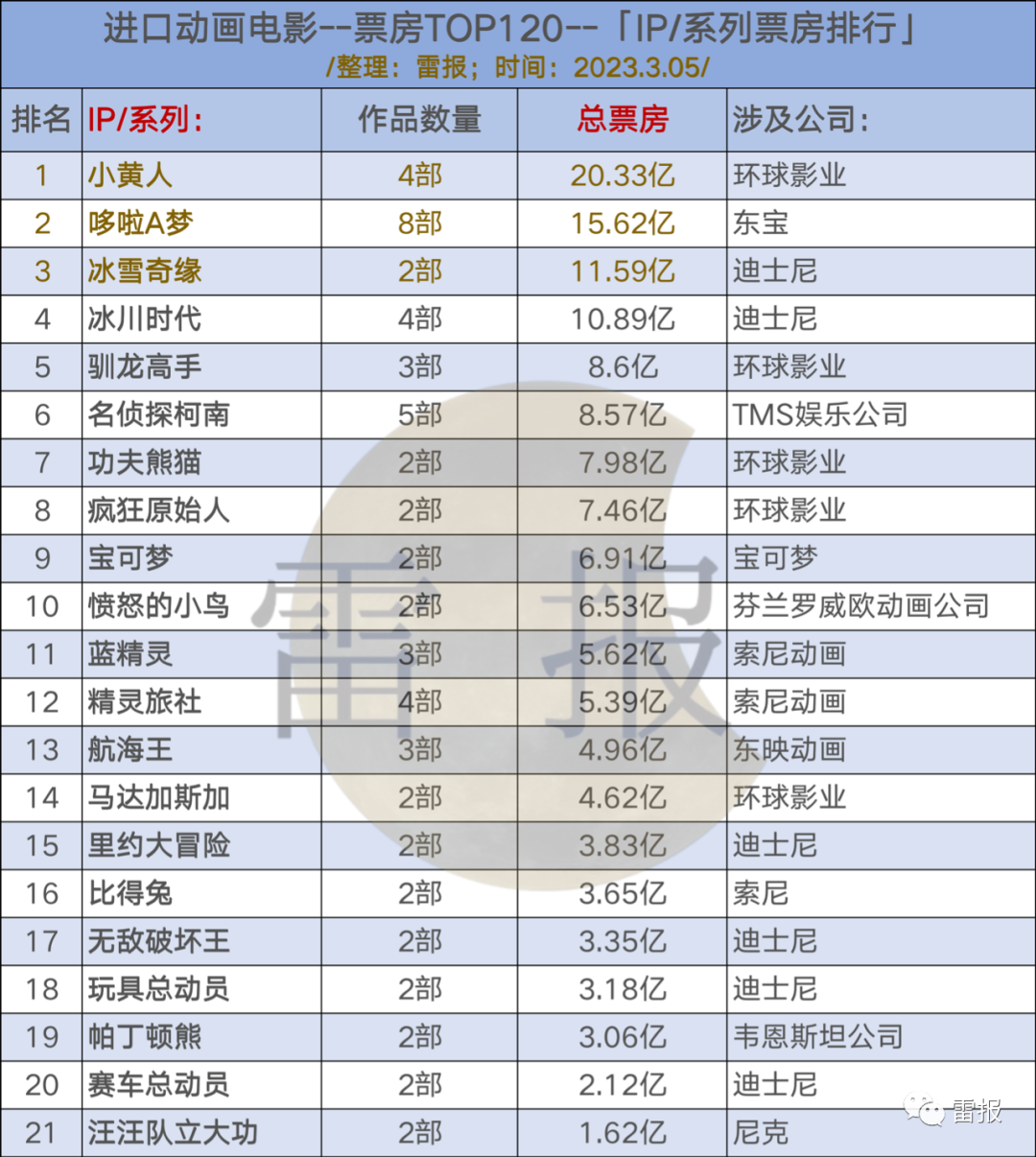 基于在这120部中IP/系列作品“数量大于一部”的标准,经过整理和汇总,共统计出21个IP/系列,分别为《小黄人》、《冰雪奇缘》、《宝可梦》、《功夫熊猫》、《哆啦A梦》、《愤怒的小鸟》、《冰川时代》、《驯龙高手》、《疯狂原始人》、《无敌破坏王》、《马达加斯加》、《蓝精灵》、《里约大冒险》、《名侦探柯南》、《精灵旅社》、《帕丁顿熊》、《航海王》、《玩具总动员》、《比得兔》、《赛车总动员》,以及《汪汪队立大功》。(手动统计,供参考)