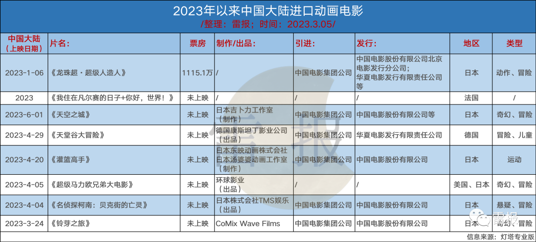 值得一提的是,据查询,2023年引进动画电影为8部(3月5日统计),除了今年1月上旬上映的《龙珠超·超级人造人》(票房1115.1万)、以及1部仅显示片名和地区等基础信息的电影、和1部由德国康斯坦丁影业公司出品,名为《天堂谷大冒险》的影片,3月5日显示的“一周内地想看榜”涉及的10部作品,上面介绍的剩下几部影片全部“入围”,数量占到一半。