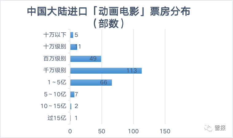 首先根据灯塔专业版数据,迄今中国大陆进口动画电影254部(不含未上映和无票房作品)。从票房分布来看,过15亿1部;10亿级别、未及15亿的电影有2部;5到10亿之间7部;1~5亿则达到了66部,占比第二高,约26%。