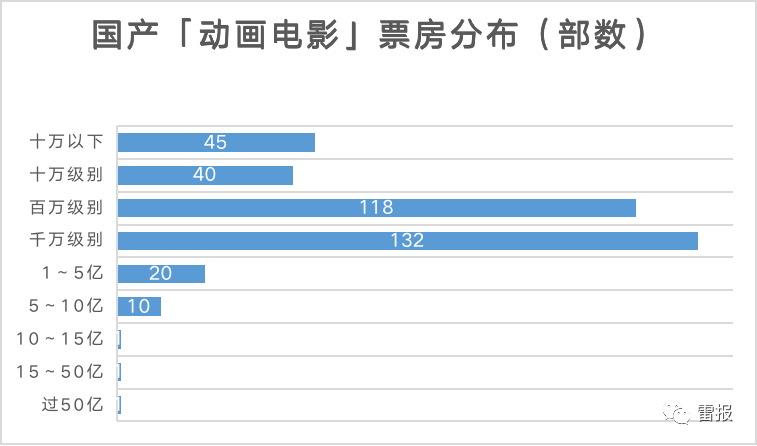 此外,千万级别票房的国产动画电影有132部,超出引进片近20部;票房百万级别国产动画电影118部,大大超出引进片;十万级别40部,引进片为11部。