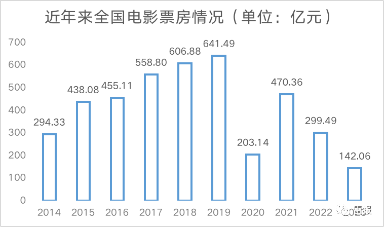 灯塔专业版显示:2014-2018年,中国大陆总票房分别为294.33亿、438.08亿、455.11亿、558.80亿、606.88亿;2019-2022分别为641.49亿、203.14亿、470.36亿、299.49亿。而今年到目前为止,票房为142.06亿。