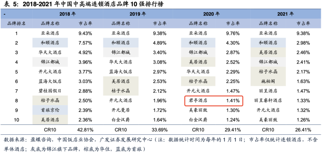 虽然君亭等来了“风口”,但所面临的市场竞争也愈发激烈。亚朵、锦江、华住、首旅等头部品牌同样开始发力中高端酒店市场,并凭借规模优势获得了行业领先的市场份额。在一份广发证券结合盈蝶咨询和中国饭店协会数据整理的2018-2021年中国中高端连锁酒店品牌十强榜单中,君亭仅在2020年位居第8,其余年份则排在了十名开外。