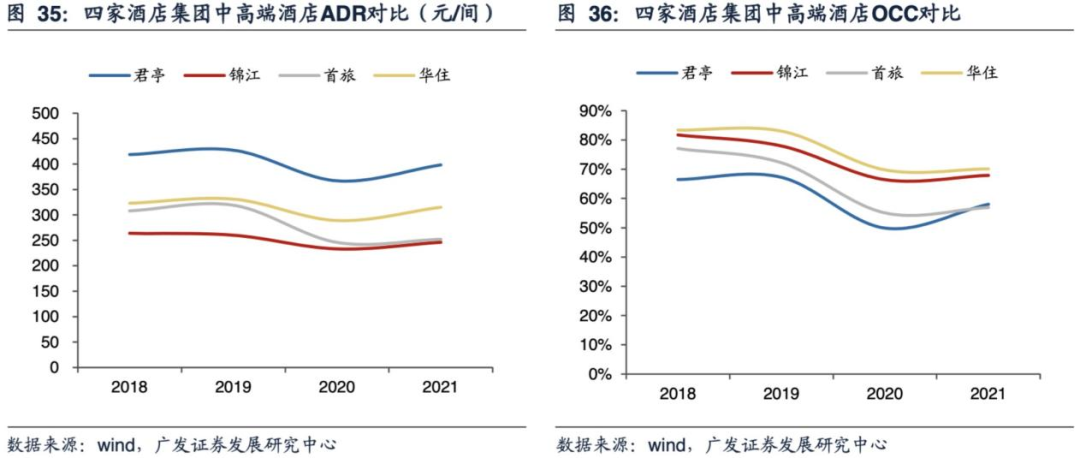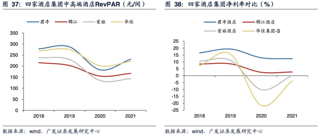 或许,数据更加能够直观的反映君亭强大的市场竞争力。Wind数据显示,2018-2021年间,君亭的ADR(已售房平均房价)始终保持在400元/间夜左右,远高于锦江、首旅、华住等竞争对手。虽然OCC(客房入住率)一般,但凭借ADR的绝对优势,君亭的RevPAR(平均每间可售房收入)除了2020年以外均位居第一。而在净利率水平上,聚焦于中高端酒店业务的君亭,始终稳定保持在10%以上,处于绝对领先地位。