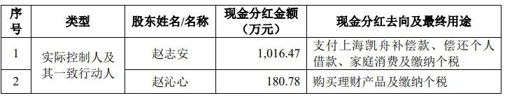 值得注意的是,赵志安此次获得分红1016.47万元,在现金分红去向及最终用途一栏中标明,“支付上海凯舟补偿款、偿还个人借款、家庭消费及缴纳个税”。