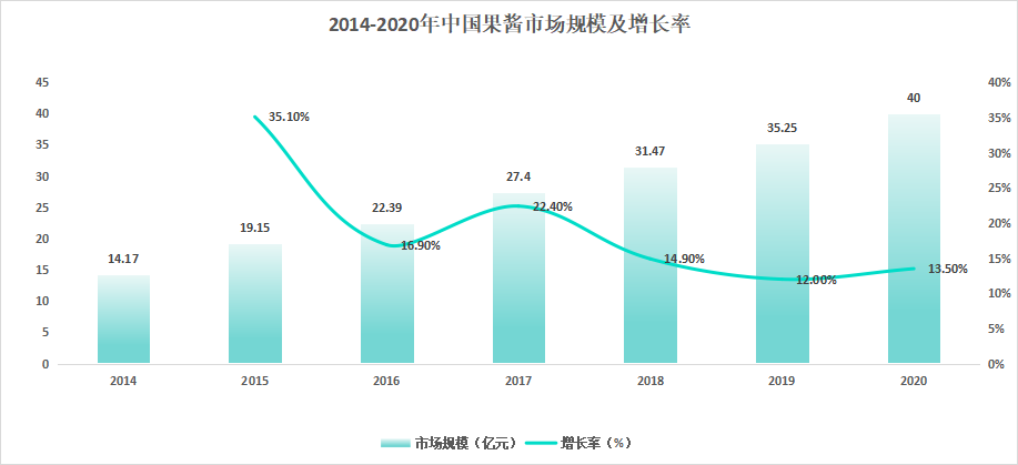 华经产业研究院数据显示,国内果酱产量从2014年19万吨增长至2020年30万吨,年复合增长率达到7.7%。另据中国香精香料化妆品工业协会的数据显示,2020年中国果酱零售规模达到40亿元,同比增长18.8%。